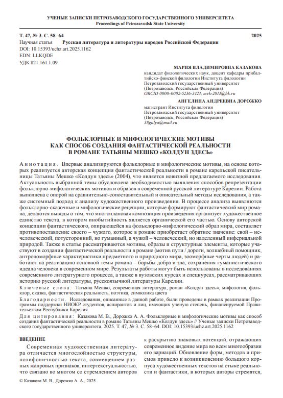 Впервые анализируются фольклорные и мифологические мотивы, на основе которых реализуется авторская концепция фантастической реальности в романе карельской писательницы Татьяны Мешко «Колдун здесь» (2004), что является новизной предлагаемого исследования. Актуальность выбранной темы обусловлена необходимостью выявления способов репрезентации фольклорно-мифологических мотивов и образов в современной русской литературе Карелии. Работа выполнена с опорой на сравнительно-сопоставительный и описательный методы исследования, а также системный подход к анализу художественного произведения.