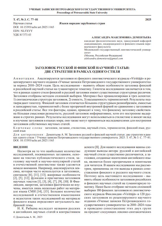 Анализируются заголовки из финского лингвистического журнала «Virittäjä» и рецензируемого научного издания «Ученые записки Петрозаводского государственного университета» за период 2010–2024 годов. Цель исследования – выявить общие особенности заголовка финской и российской научной статьи на гуманитарную тематику. Гипотеза исследования заключается в том, что в рамках одного стиля финский и русский заголовки имеют существенные структурные различия. Заголовки отобраны методом сплошной выборки. Материал был проанализирован в трех аспектах: 1) синтаксическая структура заголовков, 2) емкость, 3) насыщенность терминологией. Результаты подтверждают гипотезу. Финский заголовок отличается бо́льшим структурным разнообразием, емкостью и лапидарностью, терминологией с более прозрачной внутренней формой по сравнению с заголовком в российской статье. Все эти факторы, однако, приводят к тому, что финскому заголовку свойственна бо́льшая смысловая размытость; русский заголовок информативнее, хотя его построение выдержано в строгих рамках. Результаты исследования могут использоваться в стилистике и вносят вклад в изучение заголовков в языках мира; они также могут применяться исследователями для построения заголовков собственных научных статей.