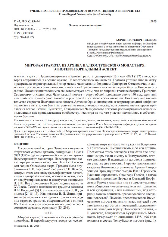 Проанализирована мировая грамота, датируемая 13 июля 6883 (1375) года, которая сохранилась в составе архива Палеостровского монастыря. Грамота устанавливала межу и разрешала территориальный спор между челмужским боярином Григорием Семеновичем и жителями трех заонежских погостов и поселений, расположенных на западном берегу Повенецкого залива. Локализация топонимов свидетельствует о том, что по мировой грамоте боярину Григорию Семеновичу отходил весь Челмужский погост – округ общей площадью около 170 тыс. десятин, что приблизительно сопоставимо с территорией трех заонежских погостов. Показано, что вмешательство старосты Имоченицкого погоста Артемия Ори с «племенем» в территориальный конфликт позволяет считать, что были затронуты не только экономические, но и этнические интересы приоятских вепсов. Земли Шунгского, Толвуйского и Челмужского погостов рассматривались вепсским «племенем» как принадлежащие сообществу, несмотря на то, что участки находились в собственности боярина.