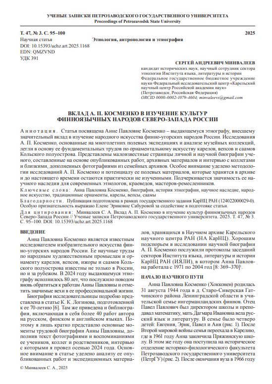Статья посвящена Анне Павловне Косменко – выдающемуся этнографу, внесшему значительный вклад в изучение народного искусства финно-угорских народов России. Исследования А. П. Косменко, основанные на многолетних полевых экспедициях и анализе музейных коллекций, легли в основу ее фундаментальных трудов по орнаментальному искусству карелов, вепсов и саамов Кольского полуострова. Представлены малоизвестные страницы личной и научной биографии ученого, составленные на основе опубликованных работ, архивных материалов и интервью с коллегами и близкими, дополненных фотографиями из семейных архивов. Особое внимание уделено методологии исследований А. П. Косменко и потенциалу ее полевых материалов, которые хранятся в архиве и до настоящего времени остаются практически не изученными. Подчеркивается значимость ее научного наследия для современных этнологов, краеведов, мастеров-ремесленников.