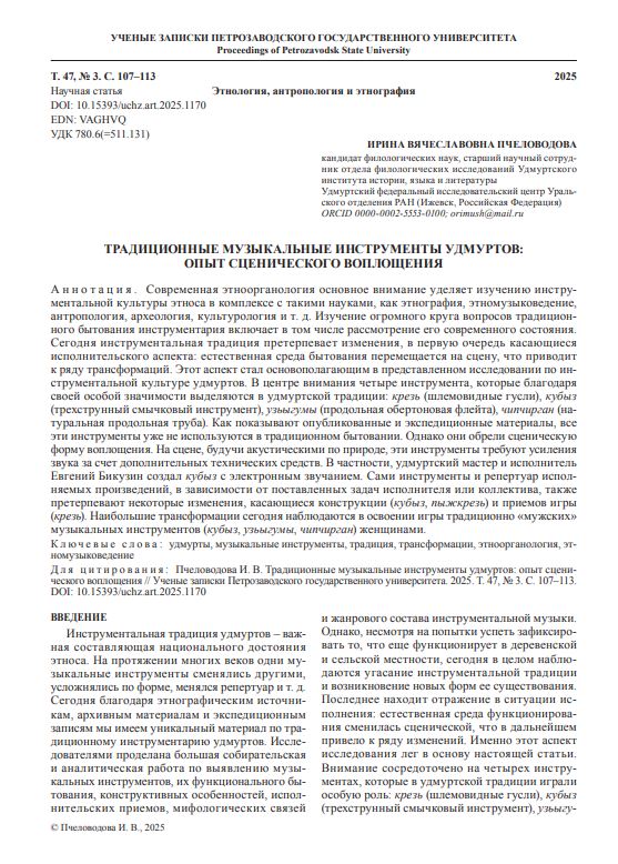 Современная этноорганология основное внимание уделяет изучению инструментальной культуры этноса в комплексе с такими науками, как этнография, этномузыковедение, антропология, археология, культурология и т. д. Изучение огромного круга вопросов традиционного бытования инструментария включает в том числе рассмотрение его современного состояния. Сегодня инструментальная традиция претерпевает изменения, в первую очередь касающиеся исполнительского аспекта: естественная среда бытования перемещается на сцену, что приводит к ряду трансформаций. Этот аспект стал основополагающим в представленном исследовании по инструментальной культуре удмуртов. В центре внимания четыре инструмента, которые благодаря своей особой значимости выделяются в удмуртской традиции: крезь (шлемовидные гусли), кубыз (трехструнный смычковый инструмент), узьыгумы (продольная обертоновая флейта), чипчирган (натуральная продольная труба).