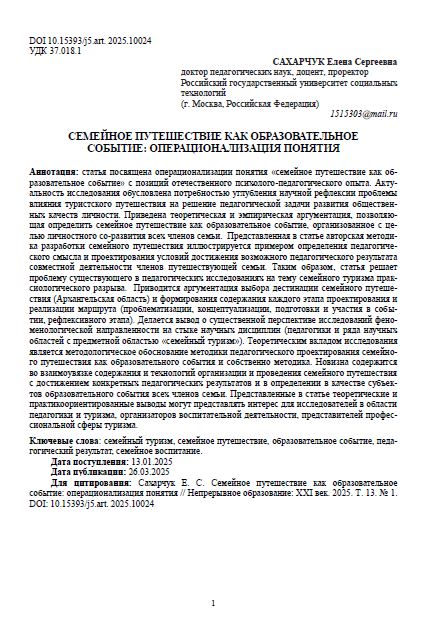 Статья посвящена операционализации понятия «семейное путешествие как образовательное событие» с позиций отечественного психолого-педагогического опыта. Актуальность исследования обусловлена потребностью углубления научной рефлексии проблемы влияния туристского путешествия на решение педагогической задачи развития общественных качеств личности.