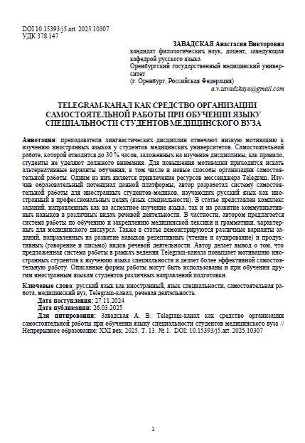 Telegram-канал как средство организации самостоятельной работы при обучении языку специальности студентов медицинского вуза