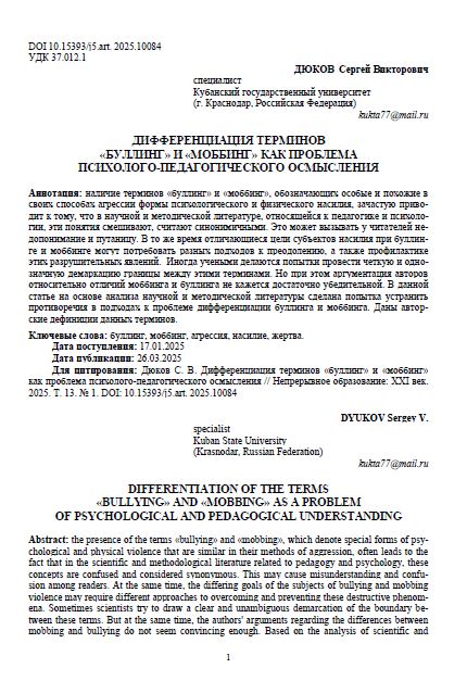 Дифференциация терминов «буллинг» и «моббинг» как проблема психолого-педагогического осмысления