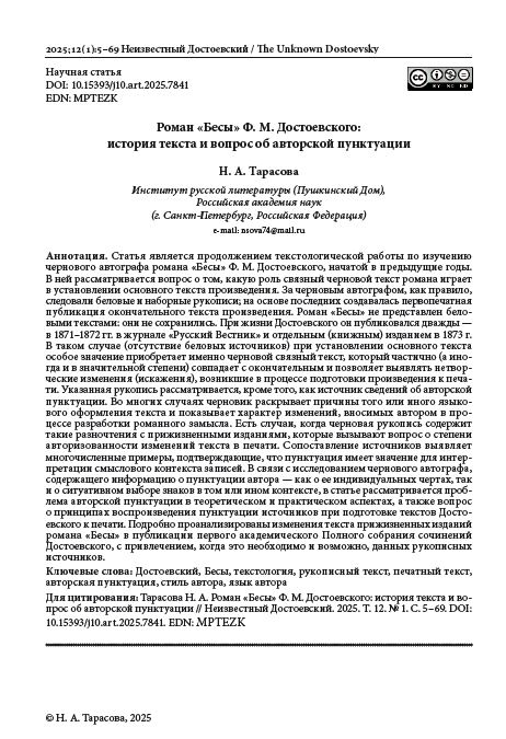 Роман «Бесы» Ф. М. Достоевского: история текста и вопрос об авторской пунктуацииАндрианова Ирина Святославовна