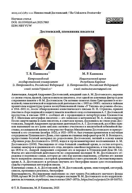 В поисках пропавших автографов Ф. М. Достоевского (из коллекции А. Ф. Кони)Панюкова Татьяна Викторовна, Каюмова Мадина Расуловна
