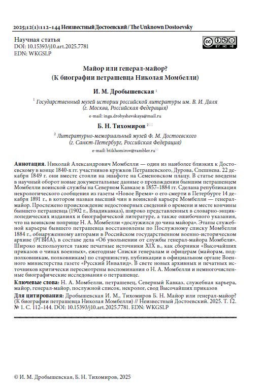 Майор или генерал-майор? (К биографии петрашевца Николая Момбелли)Федорова Елена Алексеевна