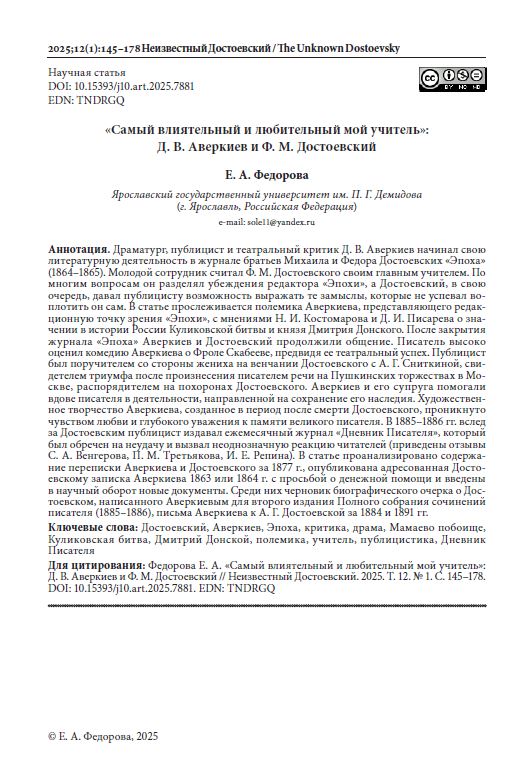«Самый влиятельный и любительный мой учитель»: Д. В. Аверкиев и Ф. М. Достоевский