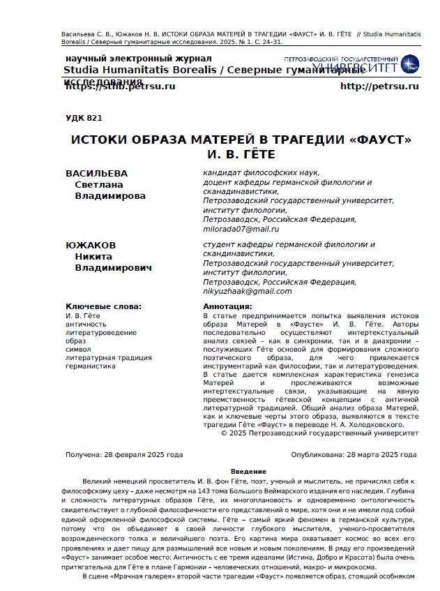 В статье предпринимается попытка выявления истоков образа Матерей в «Фаусте» И. В. Гёте. Авторы последовательно осуществляют интертекстуальный анализ связей – как в синхронии, так и в диахронии – послуживших Гёте основой для формирования сложного поэтического образа, для чего привлекается инструментарий как философии, так и литературоведения. В статье дается комплексная характеристика генезиса Матерей и прослеживаются возможные интертекстуальные связи, указывающие на явную преемственность гётевской концепции с античной литературной традицией. Общий анализ образа Матерей, как и ключевые черты этого образа, выявляются в тексте трагедии Гёте «Фауст» в переводе Н. А. Холодковского.