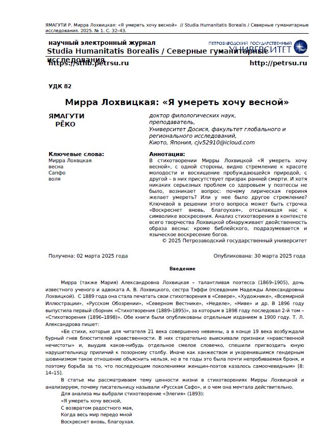 Статья посвящена анализу стихотворения Мирры Лохвицкой «Я умереть хочу весной», в котором сочетаются мотивы красоты, молодости, весеннего возрождения и трагического предчувствия смерти. Автор исследует двойственность образа весны в творчестве Лохвицкой, связывая его как с христианской символикой воскресения, так и с языческими культами плодородия.