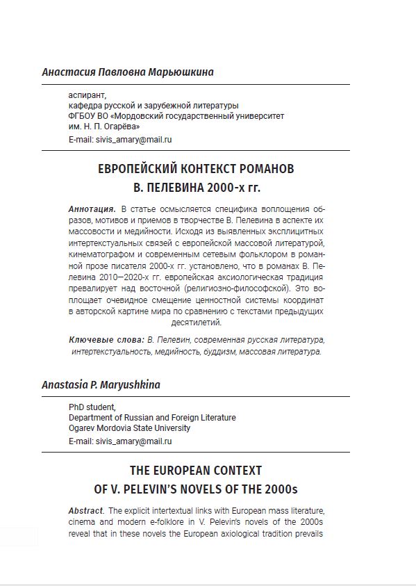В статье осмысляется специфика воплощения образов, мотивов и приемов в творчестве В. Пелевина в аспекте их массовости и медийности. Исходя из выявленных эксплицитных интертекстуальных связей с европейской массовой литературой, кинематографом и современным сетевым фольклором в романной прозе писателя 2000-х гг. установлено, что в романах В. Пелевина 2010–2020-х гг. европейская аксиологическая традиция превалирует над восточной (религиозно-философской). Это воплощает очевидное смещение ценностной системы координат в авторской картине мира по сравнению с текстами предыдущих десятилетий.