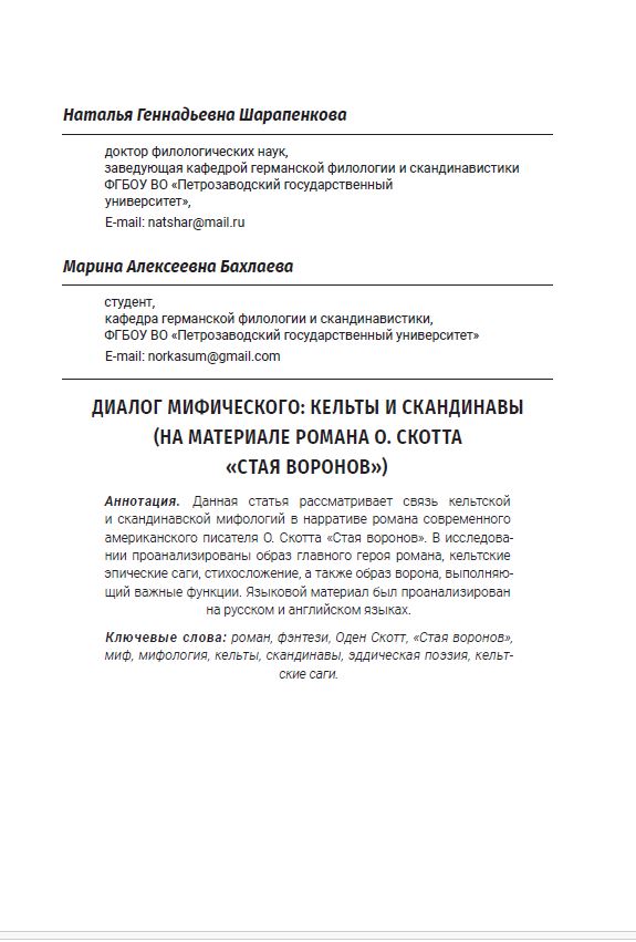Диалог мифического: кельты и скандинавы (на материале романа О. Скотта «Стая воронов»)Тимошкина Мария Игоревна, Шарапенкова Наталья Геннадьевна