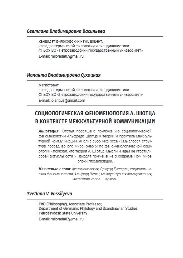 Социологическая феноменология А. Шютца в контексте межкультурной коммуникацииВасильева Светлана Владимировна, Павлова Екатерина Андреевна
