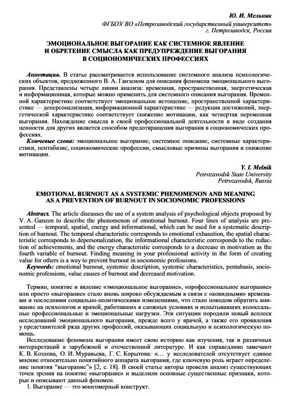 Эмоциональное выгорание как системное явление и обретение смысла как предупреждение выгорания в социономических профессиях