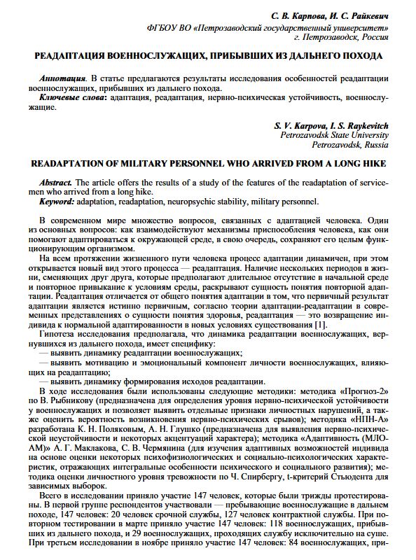 В статье предлагаются результаты исследования особенностей реадаптации военнослужащих, прибывших из дальнего похода.