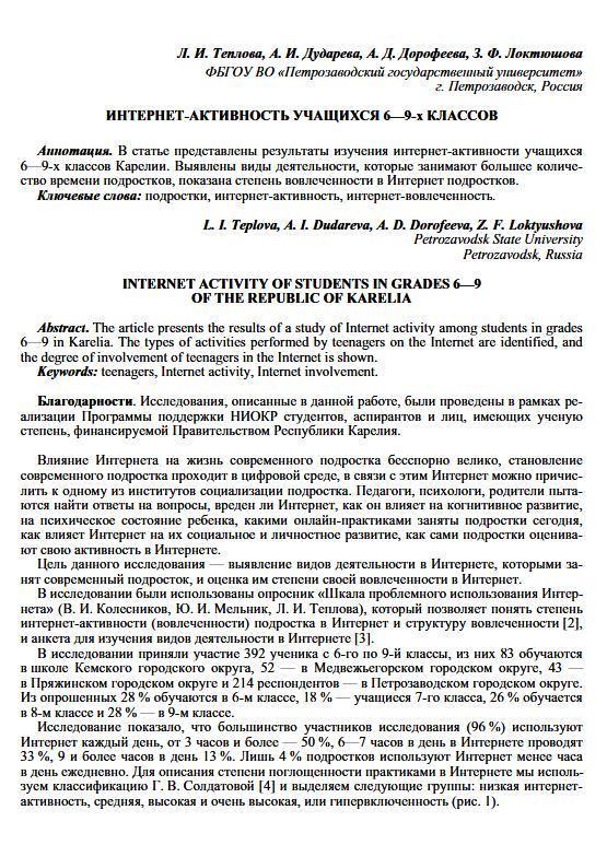 В статье представлены результаты изучения интернет активности учащихся 6–9 х классов Карелии. Выявлены виды деятельности, которые занимают большее количество времени подростков, показана степень вовлеченности в Интернет подростков.