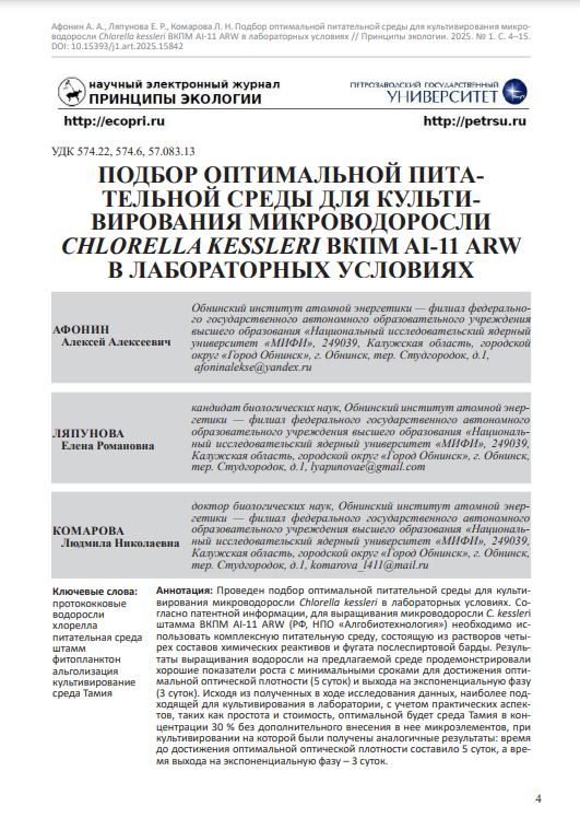 Подбор оптимальной питательной среды для культивирования микроводоросли Chlorella kessleri ВКПМ AI-11 ARW в лабораторных условиях