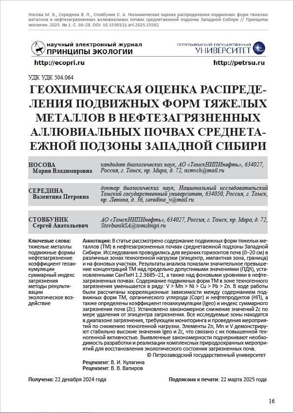 Геохимическая оценка распределения подвижных форм тяжелых металлов в нефтезагрязненных аллювиальных почвах среднетаежной подзоны Западной СибириРавкин Юрий Соломонович, Цыбулин Сергей Михайлович, Чеснокова Светлана Витальевна, Лялина Мария Игоревна