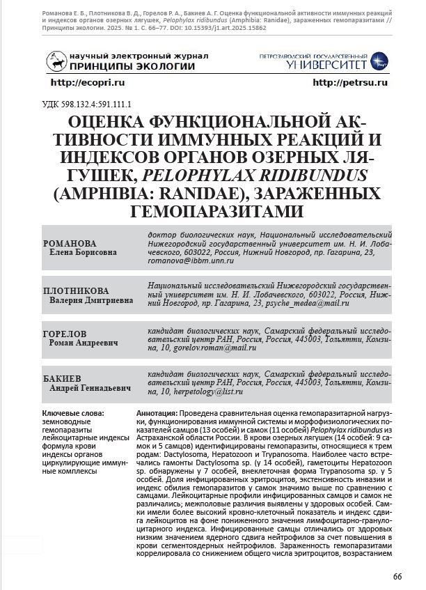 Оценка функциональной активности иммунных реакций и индексов органов озерных лягушек, Pelophylax ridibundus (Amphibia: Ranidae), зараженных гемопаразитами