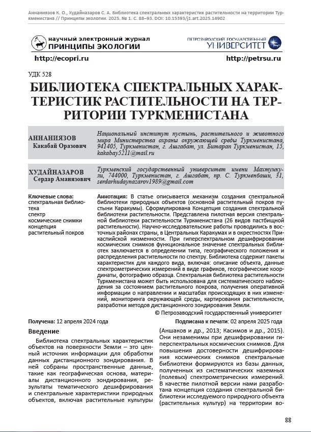 В статье описывается механизм создания спектральной библиотеки природных объектов (основной растительный покров пустыни Каракумы). Сформулирована Концепция создания спектральной библиотеки растительности. Представлена пилотная версия спектральной библиотеки растительности Туркменистана (26 видов пастбищной растительности). Библиотека содержит пакеты характеристик для каждого вида, включая: описание объекта, данные спектрометрических измерений в виде графиков, географические координаты, фотографию образца.