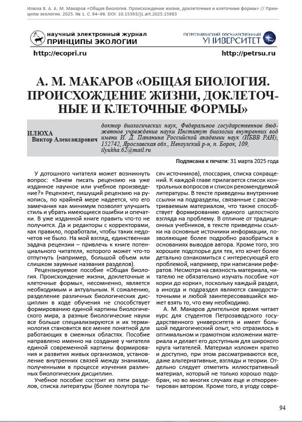 Рец. на кн.: Макаров А. М. Общая биология. Происхождение жизни, доклеточные и клеточные организмы. Петрозаводск : Издательство ПетрГУ, 2025. 601 с.
