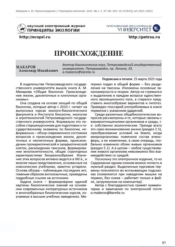 Рец. на кн.: Макаров А. М. Общая биология. Происхождение жизни, доклеточные и клеточные организмы. Петрозаводск : Издательство ПетрГУ, 2025. 601 с.