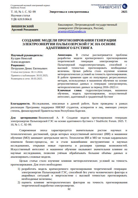Создание модели прогнозирования генерации электроэнергии Пальеозерской ГЭС на основе адаптивного бустинга