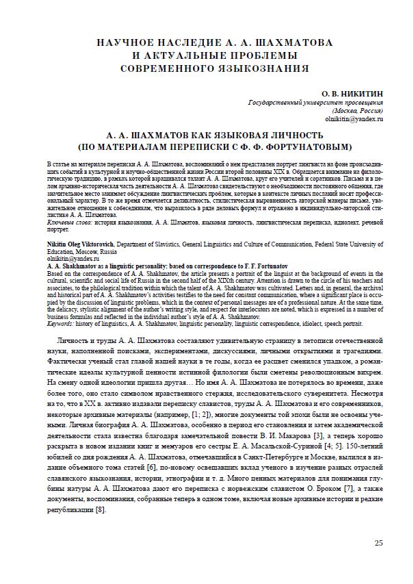 А. А. Шахматов как языковая личность (по материалам переписки с Ф. Ф. Фортунатовым)