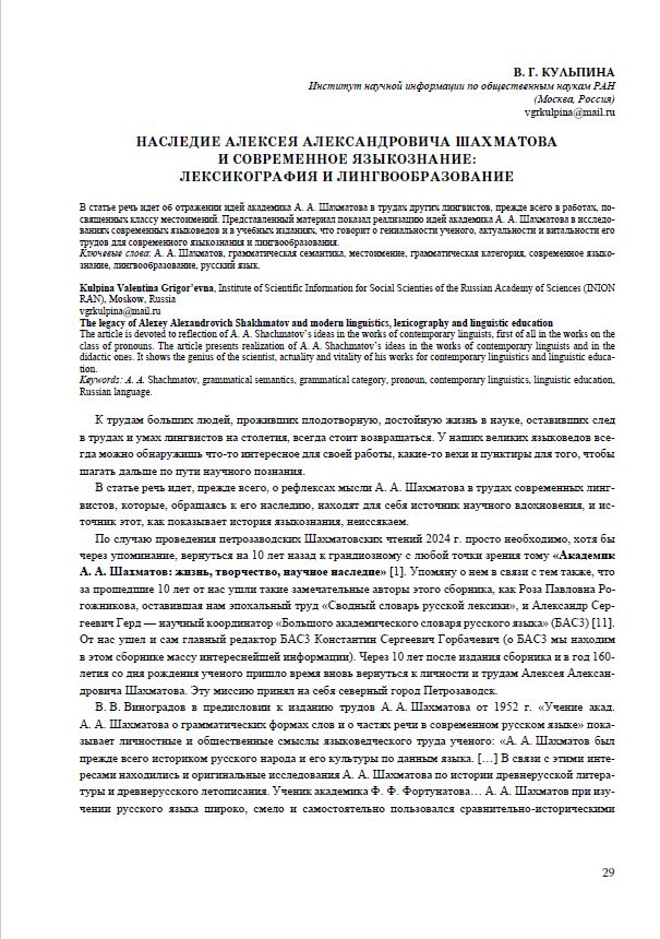 Наследие Алексея Александровича Шахматова и современное языкознание: лексикография и лингвообразование