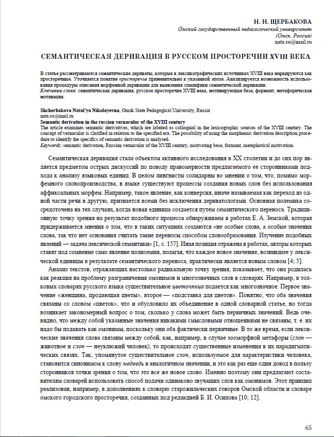 Семантическая деривация в русском просторечии ΧVΙΙΙ векаСмирнова Галина Юрьевна