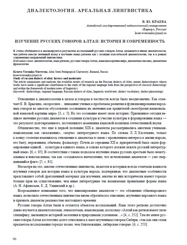 В статье обобщаются и анализируются результаты исследований русских говоров Алтая, называются имена диалектологов, чьи работы внесли значимый вклад в изучение языка региона как с позиции классической диалектологии, так и в рамках современных направлений лингвистики.