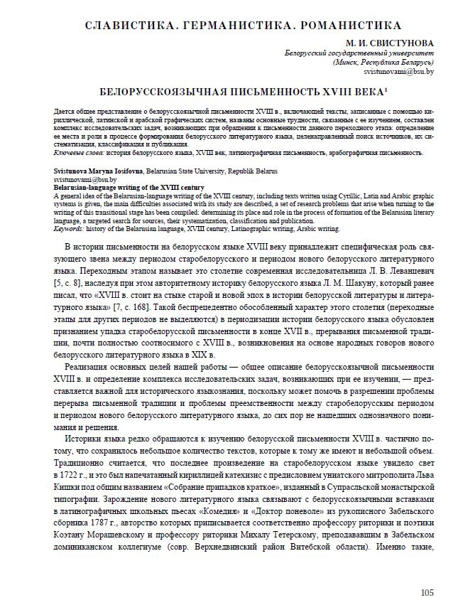 Дается общее представление о белорусскоязычной письменности XVIII в., включающей тексты, записанные с помощью кириллической, латинской и арабской графических систем, названы основные трудности, связанные с ее изучением, составлен комплекс исследовательских задач, возникающих при обращении к письменности данного переходного этапа: определение ее места и роли в процессе формирования белорусского литературного языка, целенаправленный поиск источников, их систематизация, классификация и публикация.