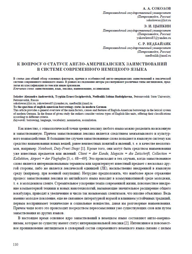 К вопросу о статусе англо-американских заимствований в системе современного немецкого языкаНедбайлик Сабина Рудольфовна, Водейго Полина Юрьевна, Гильди Александра Дмитриевна