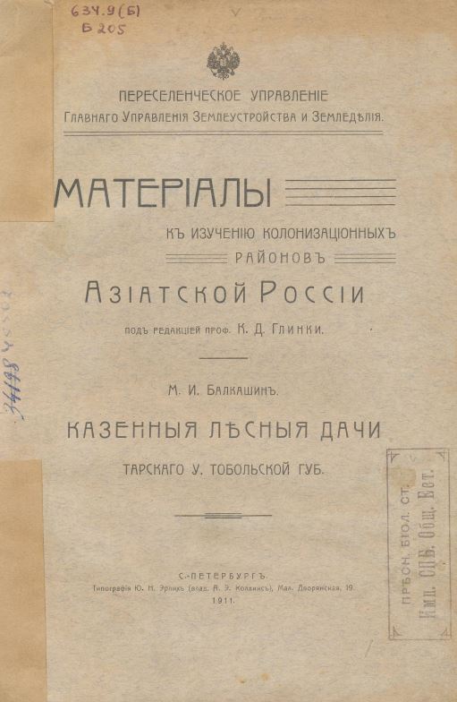 Балкашин М. Казенные лесные дачи Тарского уезда Тобольской губернии / М. Балкашин ; Переселенческое управление, Главное управление землеустройства и земледелия. — Санкт-Петербург : Типография Эрлиха, 1911. — [66] с. : ил., табл. — (Материалы к изучению колонизационных районов Азиатской России / под ред. К. Д. Глинки). — Копии страниц книги в формате pdf. — URL: http://elibrary.petrsu.ru/books/78504 (дата обращения: 23.12.2025)