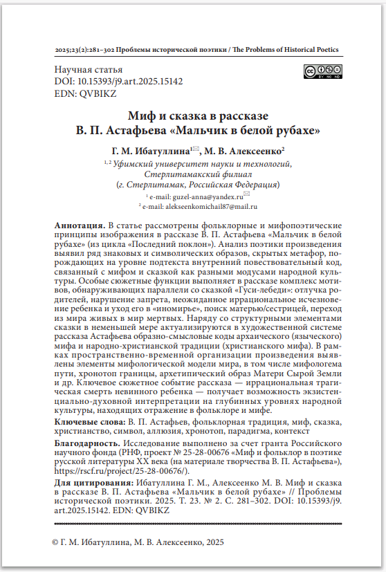 В статье рассмотрены фольклорные и мифопоэтические принципы изображения в рассказе В. П. Астафьева «Мальчик в белой рубахе» (из цикла «Последний поклон»).