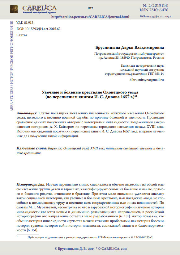 Увечные и больные крестьяне Олонецкого уезда (по переписным книгам И. С. Дивова 1657 г.)Суслова Евгения Дмитриевна