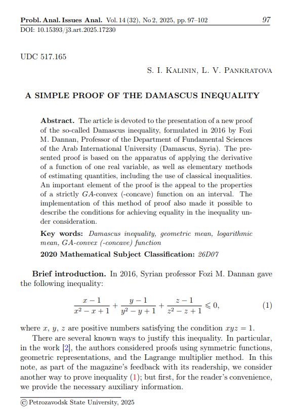 Статья посвящена изложению нового доказательства так называемого неравенства Damascus, сформулированного в 2016 году профессором кафедры фундаментальных наук Арабского международного университета (Дамаск, Сирия) Fozi M. Dannan. Представленное доказательство основано на аппарате применения производной функции одной действительной переменной, а также элементарных методах оценки величин, включая использование классических неравенств. Важным элементом доказательства является обращение к свойствам строго GA-выпуклой (-вогнутой) функции на интервале. Реализация этого метода доказательства также позволила описать условия достижения равенства при рассматриваемом неравенстве.