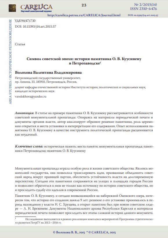 Символ советской эпохи: история памятника О. В. Куусинену в ПетрозаводскеРутт Татьяна Евгеньевна, Лунева Юлия Александровна