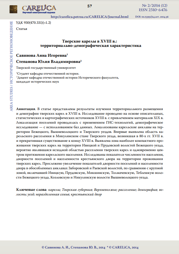 В статье представлены результаты изучения территориального размещения и демографии тверских карел в XVIII в. Исследование проведено на основе описательных, статистических и картографических источников XVIII в. с привлечением материалов XIX в. Локализация поселений проводилась с применением ГИС-технологий, демографическое исследование – с использованием баз данных. Локализованы карельские анклавы на территории Бежецкого, Вышневолоцкого и Тверского уездов. Впервые выявлена область карельского расселения в Микулинском стане Тверского уезда, возникшая в 80-х гг. XVII в. и прекратившая существование к концу XVIII в. Выявлена зона наиболее компактного проживания тверских карел на территории Ивицкой и Прудовской волостей Бежецкого уезда, вероятно являвшаяся исходной областью расселения тверских карел и одновременно центром притяжения карельского населения. Исследованы показатели численности населения, дворности поселений и населенности крестьянского двора на территории проживания тверских карел. Прослежено увеличение показателей дворности поселений и населенности двора в обособленных анклавах Заборовской и Раевской волостей, по сравнению с крупной зоной, включавшей Ивицкую, Прудовскую, Микшинскую, Толмачевскую, Теблешкую волости Бежецкого уезда, Козловскую и Никулинскую волости Вышневолоцкого уезда.