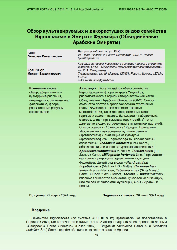 Обзор культивируемых и дикорастущих видов семейства Bignoniaceae в Эмирате Фуджейра (Объединённые Арабские Эмираты)Бялт Вячеслав Вячеславович, Коршунов Михаил Владимирович