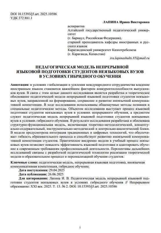Педагогическая модель непрерывной языковой подготовки студентов неязыковых вузов в условиях гибридного обучения