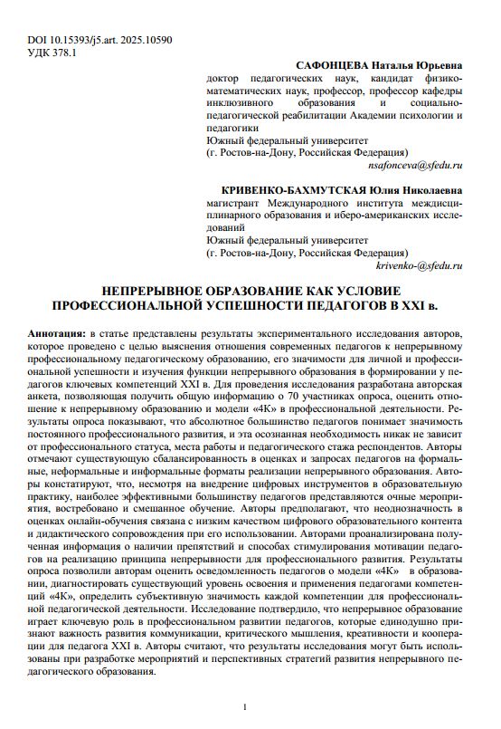В статье представлены результаты экспериментального исследования авторов, которое проведено с целью выяснения отношения современных педагогов к непрерывному профессиональному педагогическому образованию, его значимости для личной и профессиональной успешности и изучения функции непрерывного образования в формировании у педагогов ключевых компетенций XXI в.