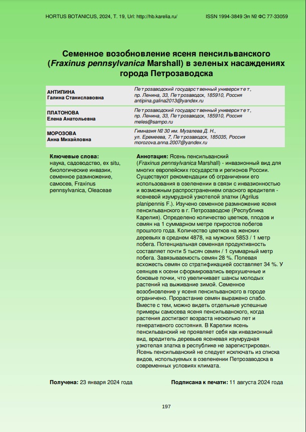 Ясень пенсильванский (Fraxinus pennsylvanica Marshall) – инвазионный вид для многих европейских государств и регионов России. Существуют рекомендации об ограничении его использования в озеленении в связи с инвазионностью и возможным распространением опасного вредителя – ясеневой изумрудной узкотелой златки (Agrilus planipennis F.). В работе изучено семенное размножение ясеня пенсильванского в г. Петрозаводске. В Карелии ясень пенсильванский не проявляет себя как инвазионный вид, вредитель деревьев ясеневая изумрудная узкотелая златка в республике не зарегистрирован. Ясень пенсильванский не следует исключать из списка видов, используемых в озеленении Петрозаводска в современных условиях климата.