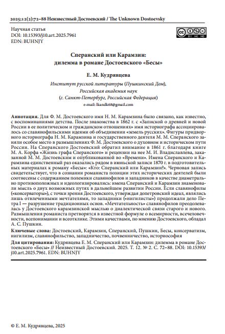 Сперанский или Карамзин: дилемма в романе Достоевского «Бесы»Федорова Елена Алексеевна