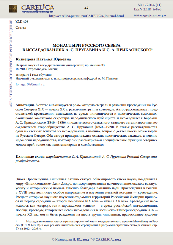 В статье анализируется роль, которую сыграли в развитии краеведения на Русском Севере в XIX – начале ХХ в. различные группы краеведов. Автор рассматривает представителей краеведения, вышедших из среды чиновничества и политических ссыльных: олонецкого колежского секретаря, народнического публициста и исследователя Карелии А. С. Приклонского (1846–1886) и политического ссыльного, ставшего затем известным исследователем старообрядчества А. С. Пругавина (1850–1920). В статье рассматривается один из частных аспектов их исследований, а именно, вопрос о деятельности монастырей на Русском Севере. Оба автора придерживались схожих политических взглядов, а именно идеологии народничества, поэтому они рассматривали специфические функции северных монастырей, такие как пенитенциарная и хозяйственная.