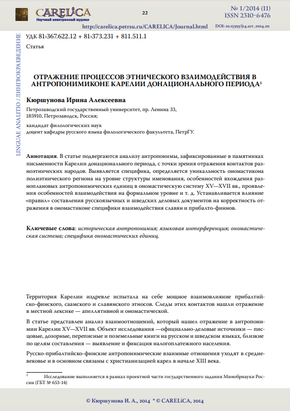 Отражение процессов этнического взаимодействия в антропонимиконе Карелии донационального периодаБрусницына Дарья Владимировна