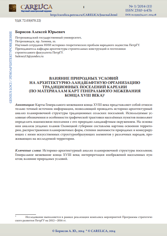 Влияние природных условий на архитектурно-ландшафтную организацию традиционных поселений Карелии (по материалам карт Генерального межевания конца XVIII века)Гусева Елена Рафхатовна