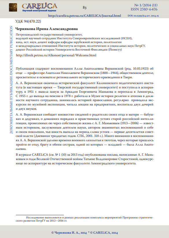 В прошлом номере журнала CARELiCA были опубликованы письма с войны Аркадия Георгиевича Манькова. Его супругой была Алла Анатольевна Вершинская, дочь известного историка и краеведа, профессора Анатолия Николаевича Вершинского. В настоящем номере мы публикуем ее воспоминания, любезно предоставленные дочерьми Аллы Анатольевны и Аркадия Георгиевича.