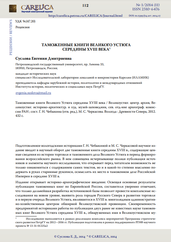 Рецензия на научное издание: Таможенные книги Великого Устюга середины XVIII века