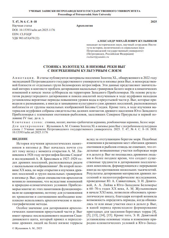 В статье публикуются материалы поселения Золотец XL, обнаруженного в 2022 году экспедицией Петрозаводского государственного университета в низовье реки Выг, в непосредственной близости от отдельных групп Беломорских петроглифов. Эти данные представляют значительный интерес в контексте проблем датирования наскальных гравировок Белого моря и климатических изменений в начале эпохи суббореала на территории Западного Прибеломорья.